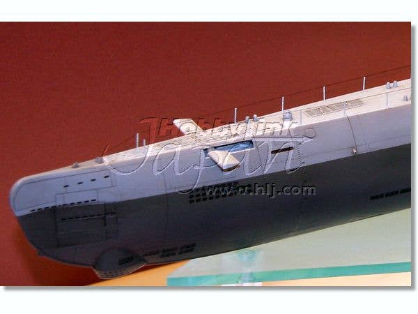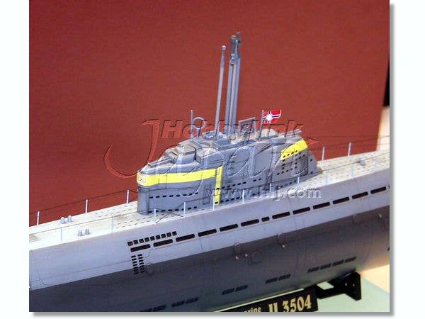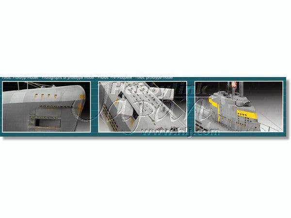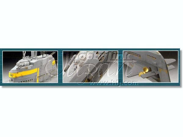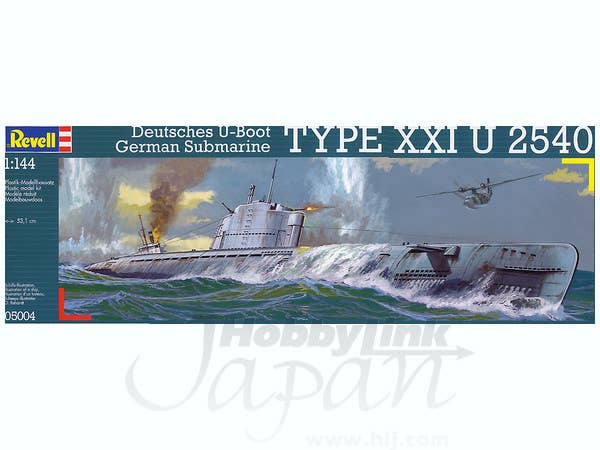 Revell's kit of the Type XXI features accurate hull details, movable front and rear hydroplanes and diving planes, rotating anti-aircraft gun turrets, extended periscope, snorkel, and other conning tower equipment, a display stand, and markings for various versions.