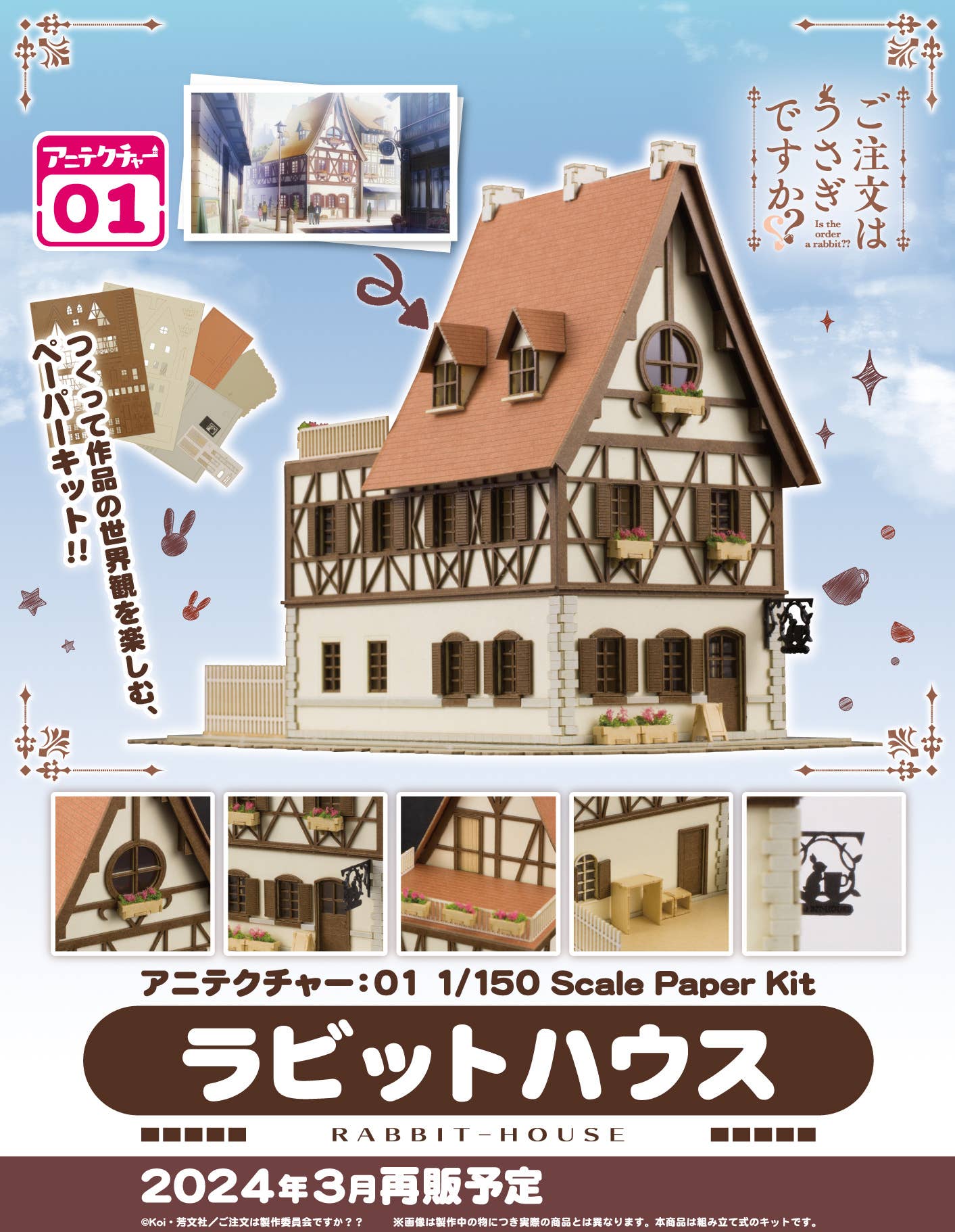 Build your own miniature Rabbit House from "Is the Order a Rabbit?" with this fun paper-craft kit from P.M.Office A! The pieces come on laser-cut sheets, so all you need is a pair of scissors to cut them out and some glue for assembly. In addition to the charming wood-framed building, small accents such as the signboard and flowerpots have also been recreated so you can enjoy the Rabbit House in intricate detail. A character sheet with Cocoa, Chino and Rize is included too. Order it for your own collection today!