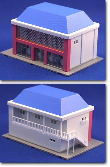 Ah, pachinko -- sweet, addictive time-waster! Unfortunately, the wonderful cheesy gaudiness of pachinko is passe these days, but you can relive pachinko's glitzy heyday with this N-gauge building! Comes pre-assembled and with extra parts for a parking lot, as well as stickers for decoration. Stickers for the sign out front are delightful and printed so that the light can shine through them. Did I say light? Yep -- this little baby has a sign that lights up, through the power of 2 AA batteries (not included). Have fun!