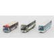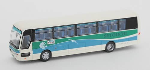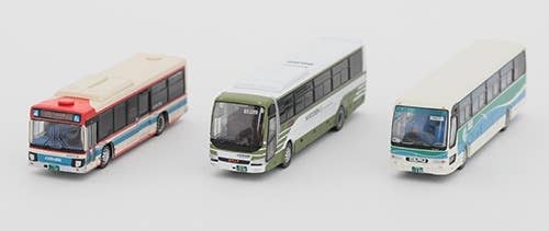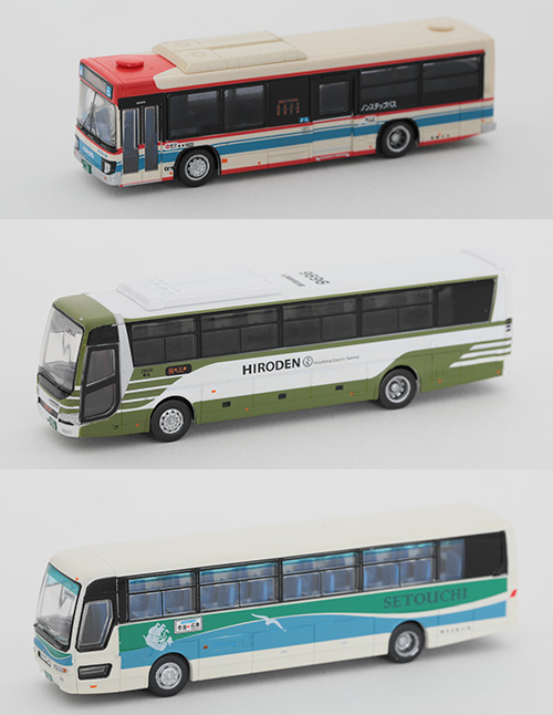 Heighten the realism of your N-gauge layout with this set of three exquisitely marked likenesses of buses as seen at Japan's Hiroshima Bus Center: an Isuzu New Erga (LV290) in Geiyo Bus livery, a Mitsubishi Fuso Aero Ace in Hiroshima Electric Railway colors, and a Mitsubishi Fuso Aero bus marked as Setouchi's Shimanami Liner. (These buses are designed for use with Tomytec's option parts BM-03 power unit and spacers F5+B9+R10/L10 and F5+B7+R8/L8, sold separately.) A trio of fine additions to the world of Tomytec!