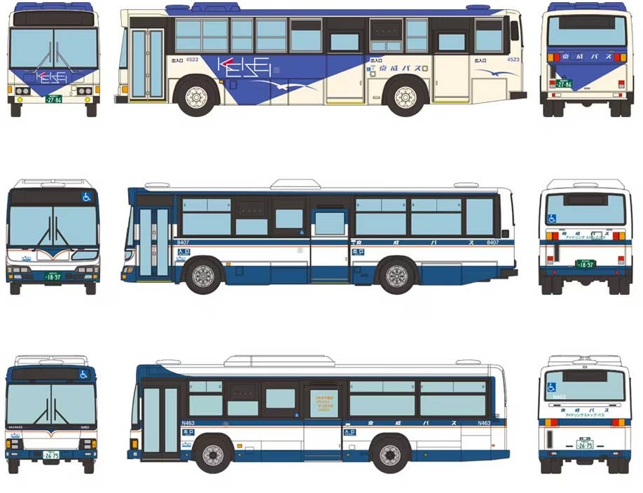 This product focuses on three Hino Blue Ribbon models, which are the mainstay models of Keisei buses: a Hino Blue Ribbon HT/HU long three-door car belonging to the Funabashi Sales Office Akanehama garage that was once active, a Hino Blue Ribbon City one-step car from the Kanamachi Sales Office days, and a Hino Blue Hino Blue Ribbon II One-Step Car from the Naganuma Office (currently registered as a chartered car belonging to the Matsudo Office) will be made into a set.