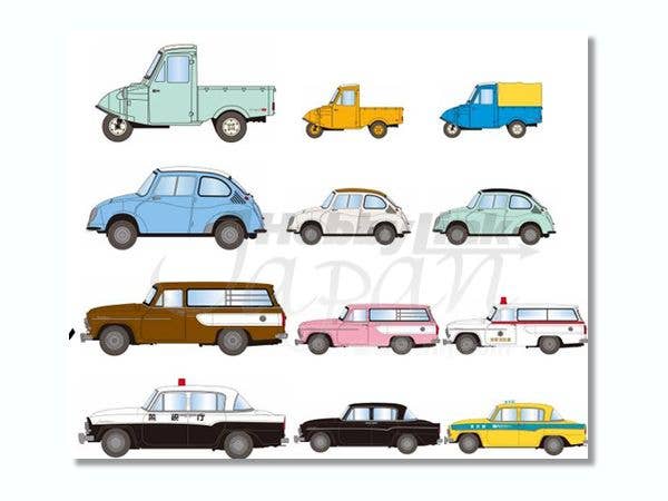 Nice collection of cars! The lineup of possible types includes four basic types (Daihatsu Midget MP, Subaru 360, Toyopet Crown, and Toyopet Masterline), each in three finishes (some are police cars!), for a subtotal of twelve...but the ubiquitous "Secret Item", for a grand total of thirteen possible type! remember though, you only get twelve cars to a box here, and those are randomly packed (see "NOTE" below).Please note that these are trading items and are individually sealed and randomly packed in boxes of 12 by the manufacturer before shipment to HobbyLink Japan. As a result we are unable to honor requests for individual or specific items, nor can we promise you which one(s) you will receive in a box. Please order only if you are willing to accept any combination of the 13 possible types.