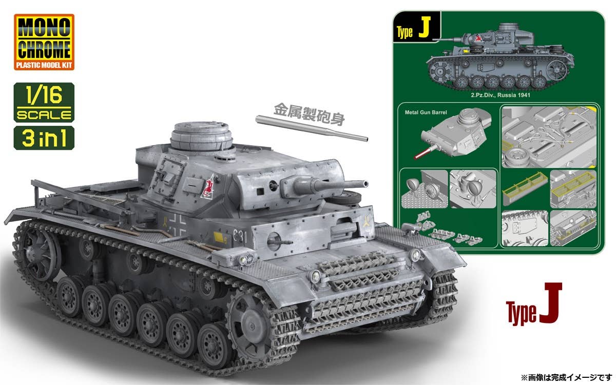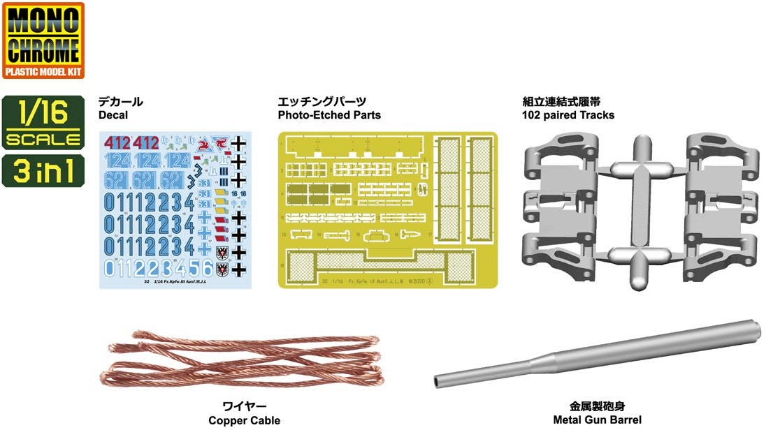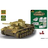 Interallied brings us an amazing model kit of the Panzer III, the main battle tank of the German Army until the middle of World War II! This three-in-one kit can be assembled as the L type, J type, or M (flamethrower) type. The hatches can be built opened or closed; the 42-caliber gun with a short metal barrel, the armored skirt on the sides of the hull, the engine room and more are all reproduced in high detail. Photo-etched parts and metal wire parts for the tow rope are included, as are decals for an incredible nine versions, including the 3rd SS Panzer Division during Operation Kursk! Place your order today!
