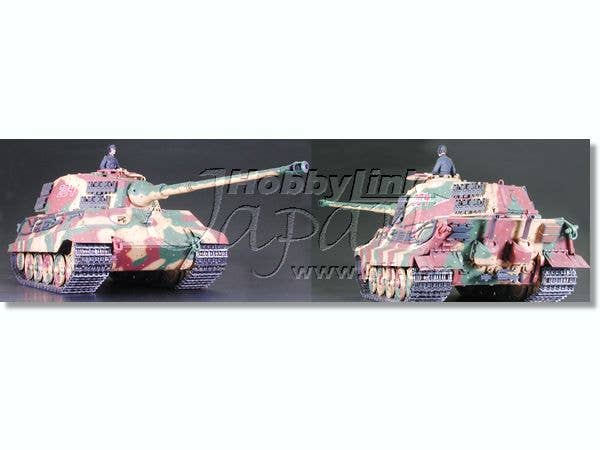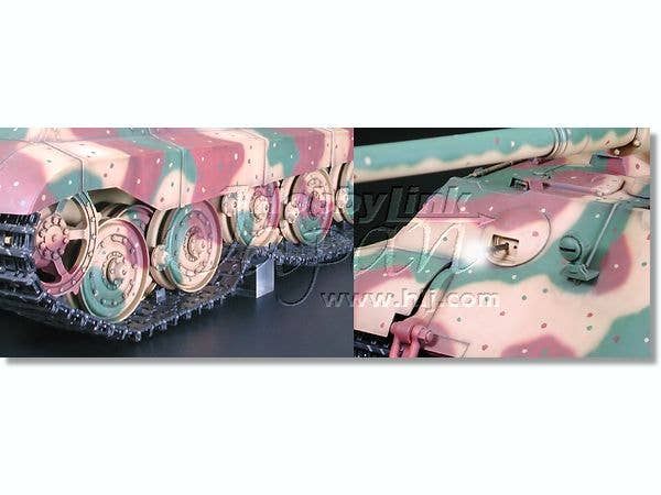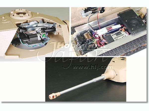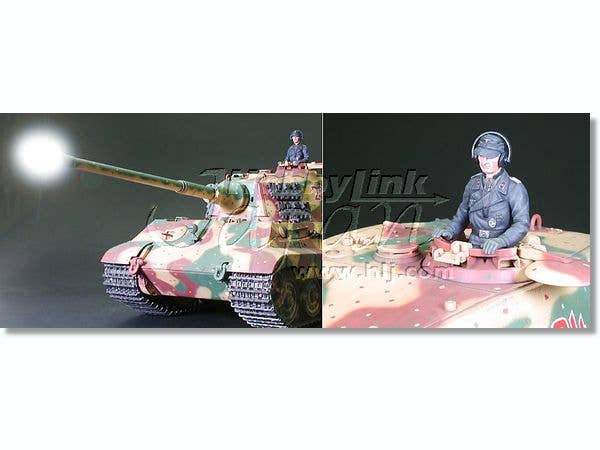 Huge, 1/16 scale radio-control tank with 4-channel operation and DMD control unit. Full operation control with forward, reverse, regular turning, pivot turning, turret rotation, recoil action and raising/lowering of the 88mm gun. The gearbox is pre-assembled. Comes with a realistic suspension system, aluminum wheels, pre-assembled tracks; also includes a 'commander' figure. Sound effects are realistic -- the engine starting, running, stopping; the turret turning; the gun raising and lowering; main and machine gun firing sounds, and the 'clanking' sound of the tracks as the tank moves. You will need to provide your own tools to assemble the tank body, including Phillips' head screwdrivers, tweezers, pliers, a modelling knife, a soldering iron, plastic cement, and rubber cement (products recommended in the instructions). Instructions are in Japanese, English, German, and French, and are accompanied by clear illustrations.