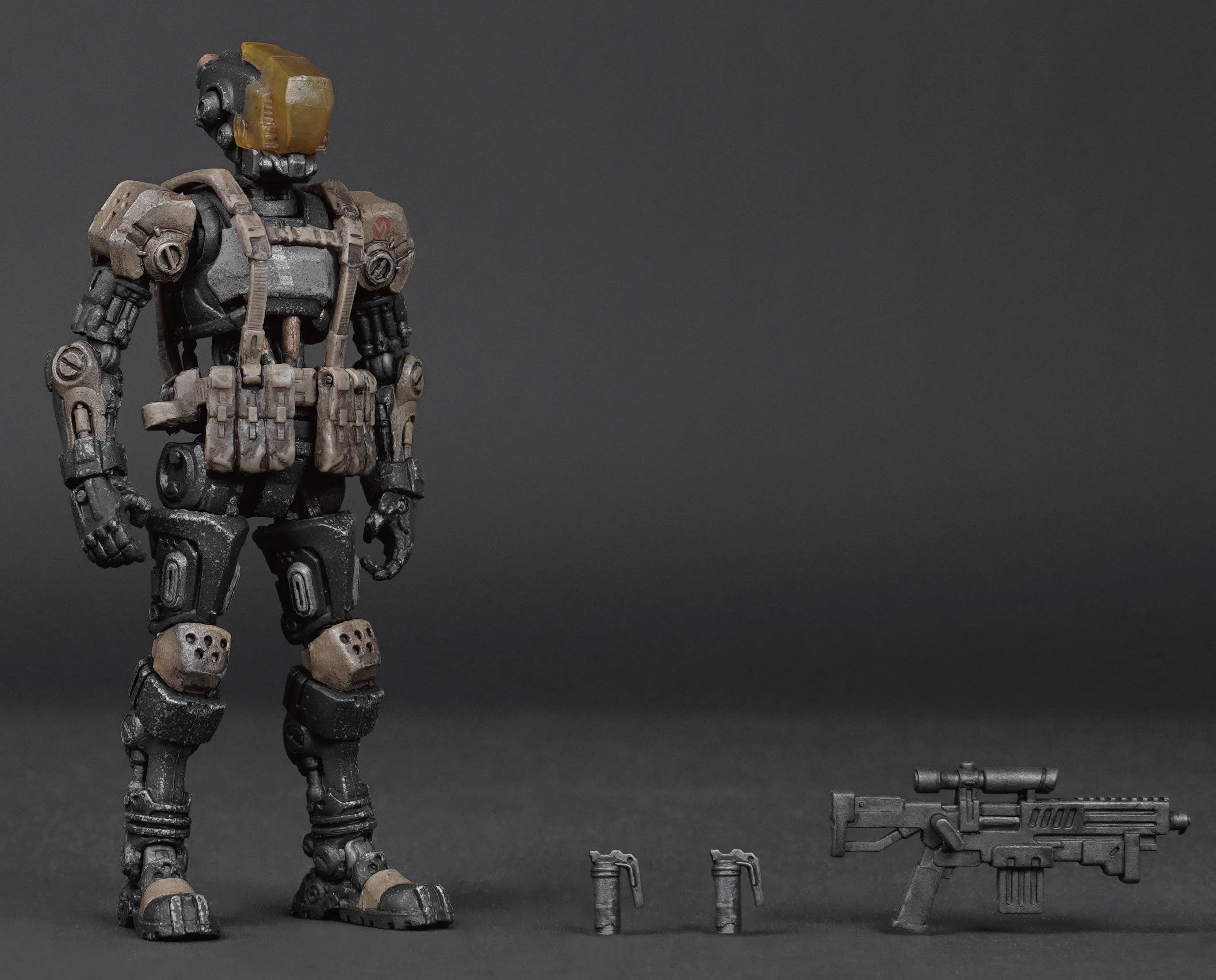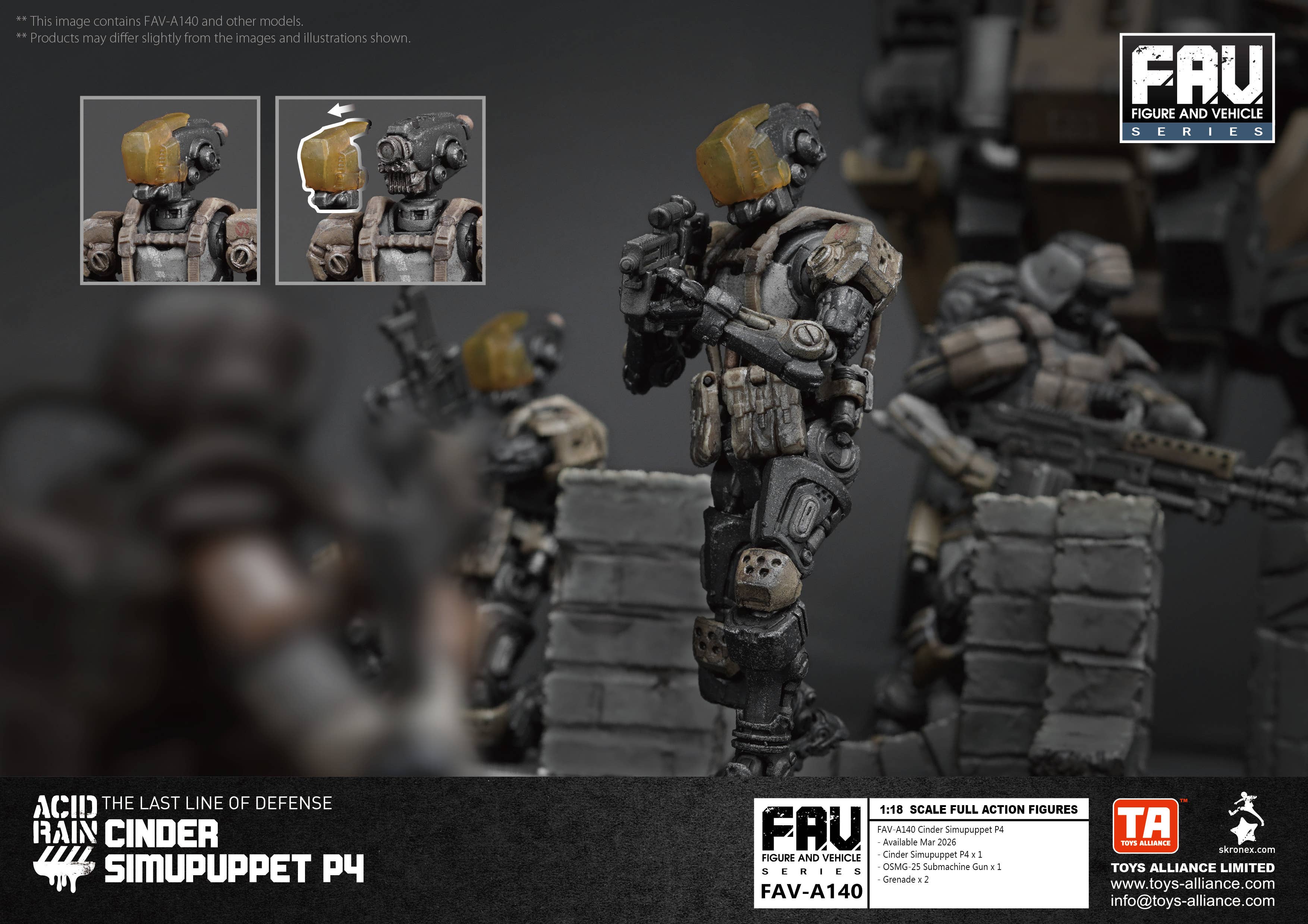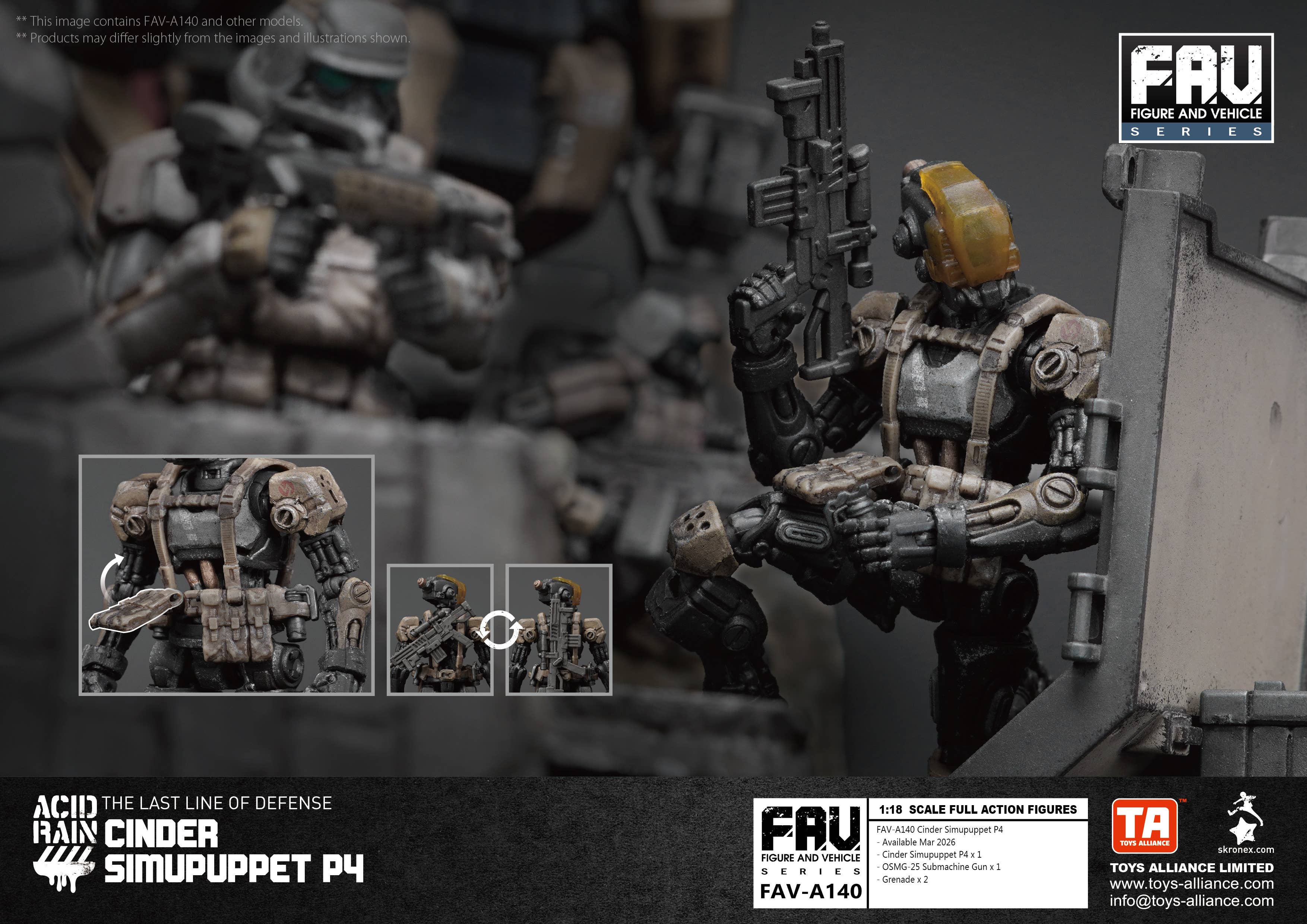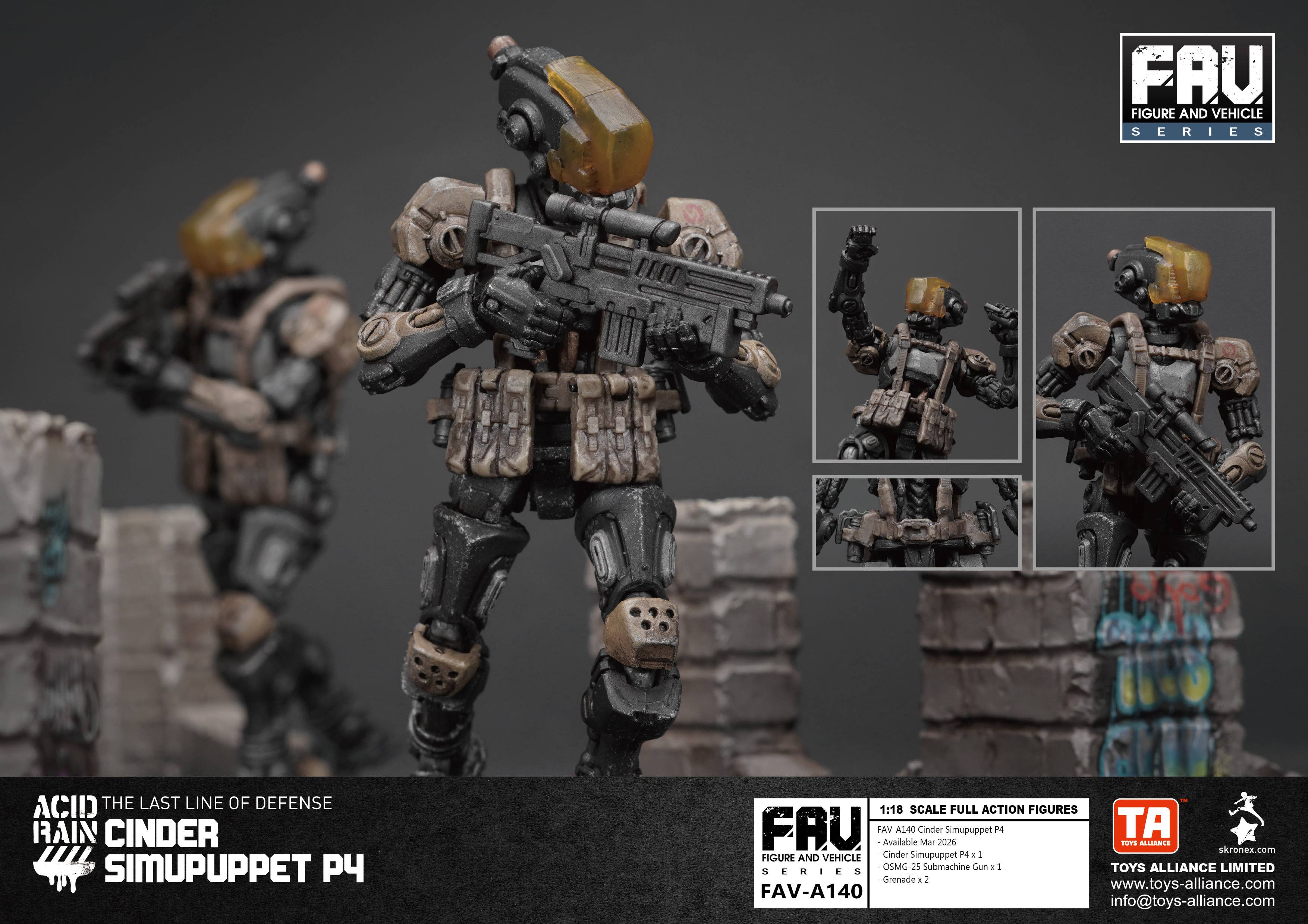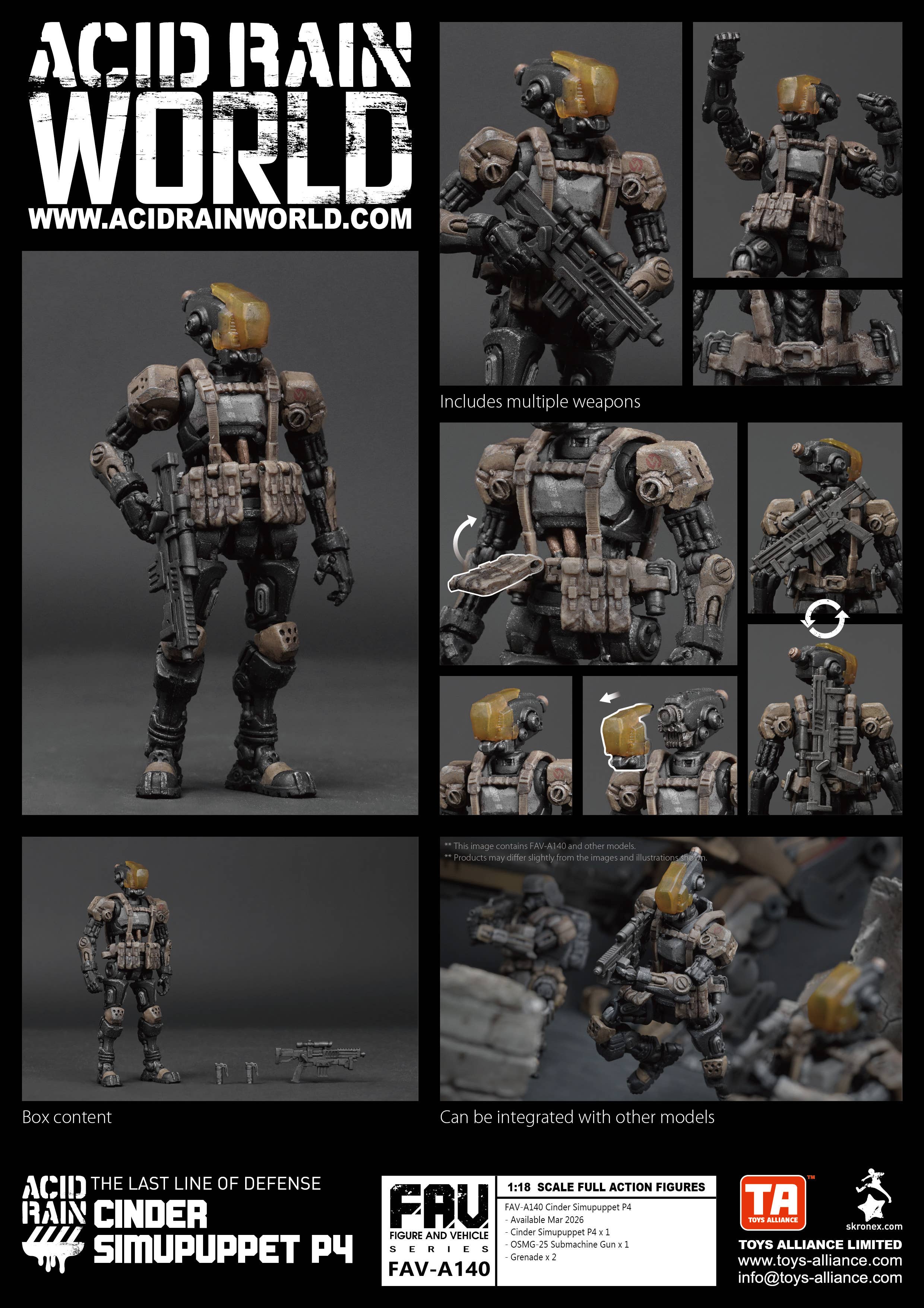 The robotic soldier Cinder Simupuppet P4 joins the 1/18-scale "Acid Rain" lineup from Toys Alliance Limited! This fully posable figure comes with all the weaponry he needs to get the job done. Order him for your own collection today!