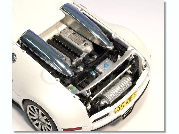 Here's a very fine fully assembled, fully finished die-cast model of the most powerful production automobile in the world, the monstrous Bugatti Veyron. Just how powerful is it? How does about 1,000 horsepower sound? Zoiks! That's good enough for a 252mph (406kph) top speed...yes, it's just that crazy! And it also costs about a million bucks, so if that's a tad out of your price range, this is the model for you! Exquisitely detailed and beautifully finished in "pearl and ice blue," this 1/18-scale Veyron features opening doors, removable engine cover, and fantastic detail everywhere you look. Fully authorized by Bugatti, the model includes a Certificate of Authenticity with serial number. A stunning work of art!