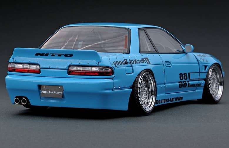This completed resin display model of the Rocket Bunny S13 version 1 in blue features 17-inch mesh wheels. It also has a silver-colored roll bar, large-diameter muffler, bucket seat, and Nardi-type steering. Created using 3D scans of the actual vehicle for an intense level of detail both inside and out -- place your order today!