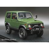 This 1/18-scale resin replica of the Suzuki Jimny (JA11) custom specification vehicle features star-shaped 16-inch spoke wheels with 2-inch lift-up specifications and white letters on the tires. Also features a front grille for the I type, front and rear over fenders in semi-gloss black, bar type front and rear bumpers, front under guard, side protector, rear tank guard, rear tire, large-diameter single-out muffler, suspension change with red shock absorbers, rear tow hook in red, Nardi-type steering, Recaro seats left and right, four-point seat belts left and right, and dress-up decals. Order yours today!