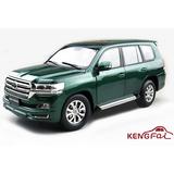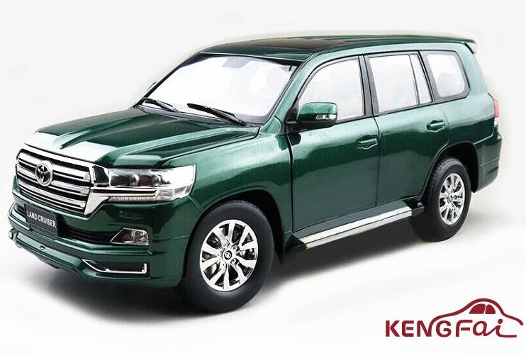 Kengfai's completed die-cast display model of the Toyota Land Cruiser in green with a black interior and right-hand drive features opening and closing doors, trunk and rear hatch, as well as rolling and steerable tires. Order yours today!