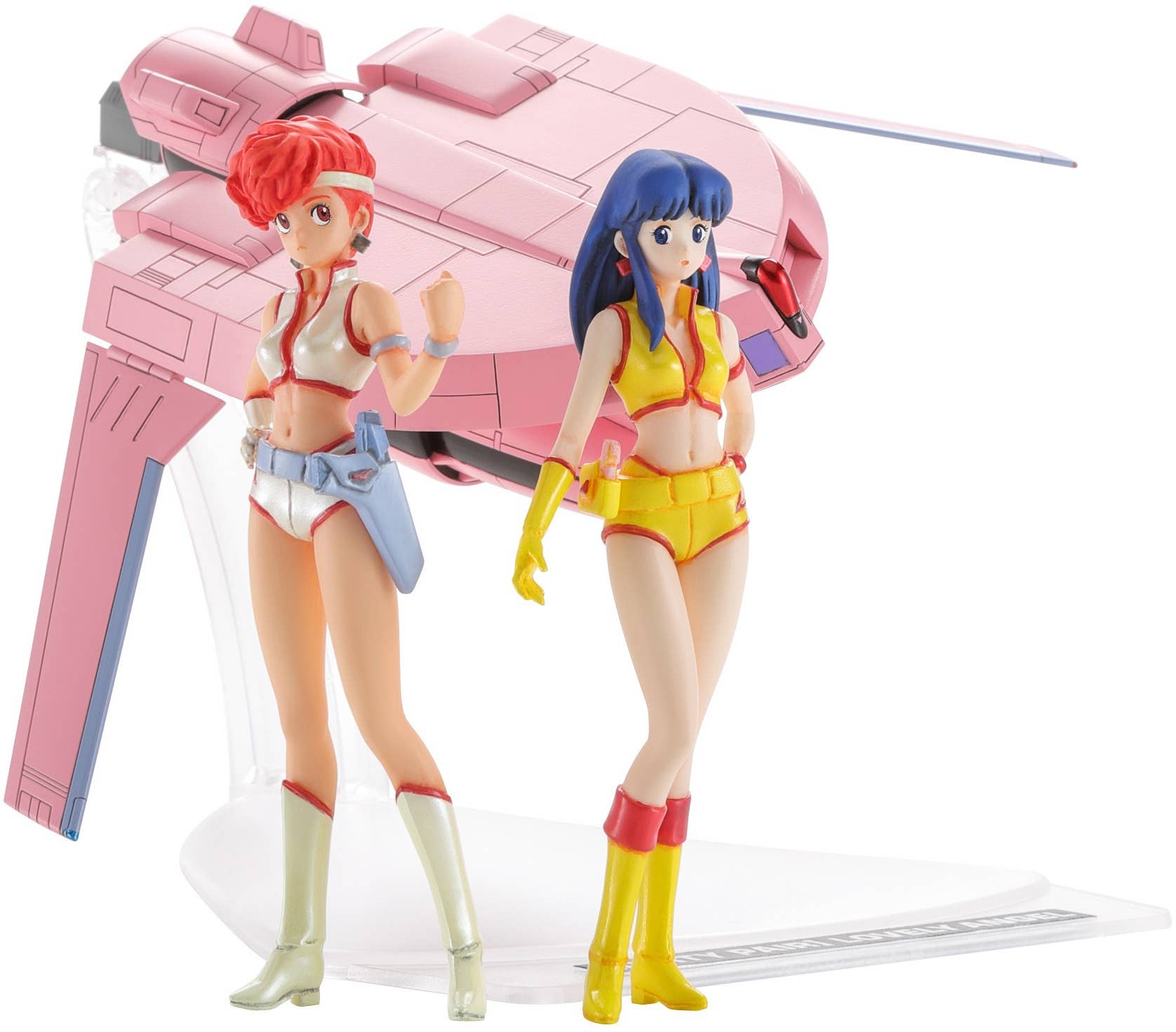 This awesome set combines a pair of 1/20-scale unassembled figure kits of Kei and Yuri, the stars of the "Dirty Pair" novels and anime, with a 1/300-scale model kit of their spaceship, the Lovely Angel! The figure kits are completely new molds, based on the classic image used in setting materials, and they're molded in fleshtone plastic; glue and paint are required. Decals for their eyes are provided. The Lovely Angel is molded in pink, and glue is not required for assembly; a clear display stand and decals are included. Order these iconic characters and their favorite ship for your own collection today!