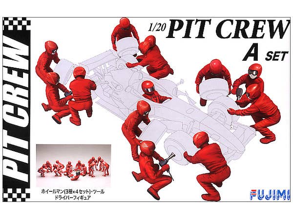 A superb set of all-newly-tooled Formula One pit crew figures in 1/20 scale! Set A includes one driver figure and twelve other crew figures (including the tire changing crew), as indicated by the letter "A" in the photos here. With decals. Includes exploded-view pictorial-type instructions, with some notes in English and Japanese.