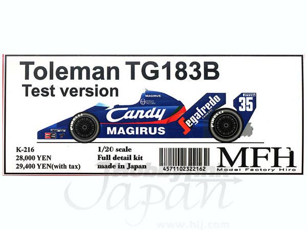 A fantastic 1/20-scale multi-media kit of the Toleman TG183B F1 test car. Model Factory Hiro's kits include resin-cast bodies, rubber tires, aluminum wheels, white metal suspension and detail parts and decals. Full engine detail is included. Assembly instructions are mainly pictorial with some guidance in English. Due to the complexity and multi-media nature of the kit, it is recommended for more experienced modelers, although any modeler confident in the basics of model building should be able to achieve good results.