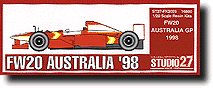 This is a curbside (no engine), multi-media rendering of the current FW20, as driven by Villeneuve and Frentzen. Includes resin body, rubber tires, turned brass wheels, white metal suspension and details, and photo-etched trim. Complete sponsor decals, too. This is an advanced kit recommended for experienced garage kit modelers. Instructions are well-illustrated, but in Japanese only.