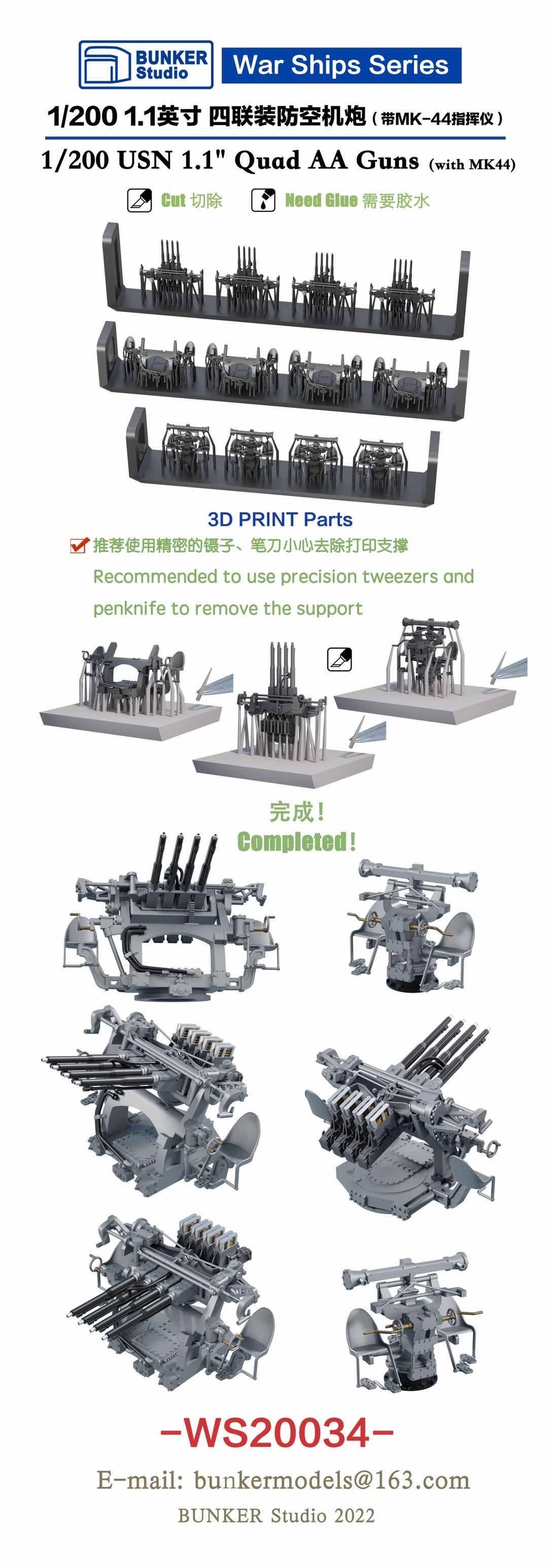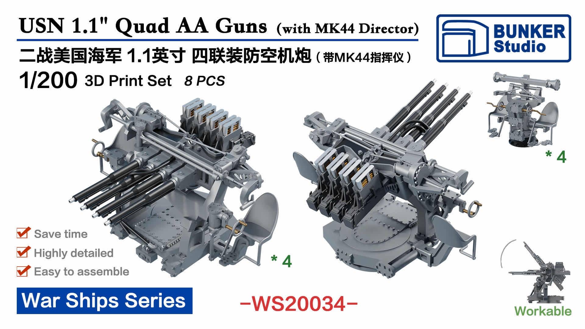 This is a set of 3D printed parts for the USN 1.1" Quad AA Guns (with MK44 Director). Order today!