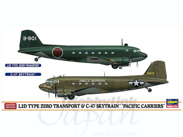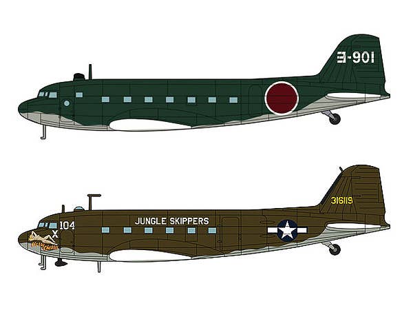 Limited reissue of the Hasegawa 1/200 scale C-47 in a two-kit boxing with markings for two Japanese L2D Type Zero Transport and one C-47 Skytrain. For marking details please see box image above.