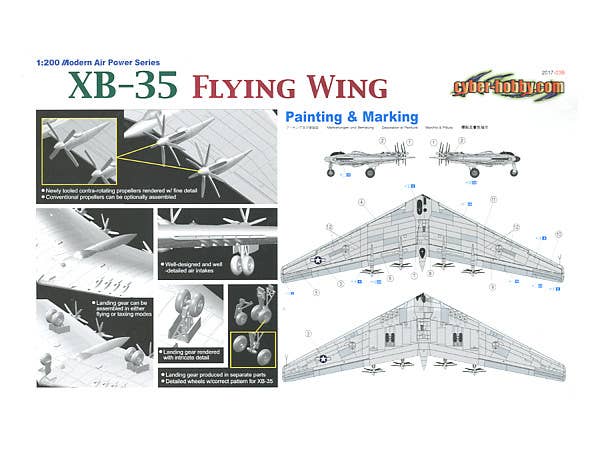 Dragon continues their 1/200 scale bomber series with this model of the XB-35. Includes detailed interior and landing gear as well as options for the original contra-rotating propellers and the later four-blade standard propellers fitted after problems with the contra-prop gearing.