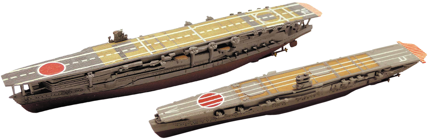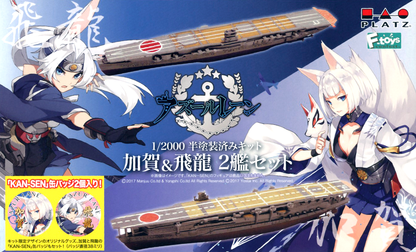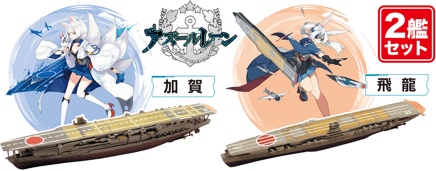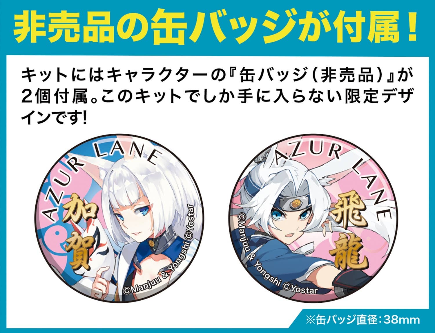 From "Azur Lane" comes a set of two partially pre-painted kits of the Kaga and Hiryu! The decks are pre-painted, so it's easy to assemble and enjoy this model without additional paint. Bases and name plates are also included so you can display both ships in their full hull form with ease. In addition, the set comes with 3.8cm can badges of Kaga and Hiryu. Order today!