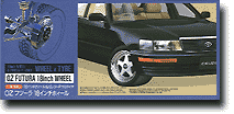 Set of 1/24 rubber tires and plastic wheels for use in customizing car models. With OZ Futura 18in tires. Includes brake assemblies.
