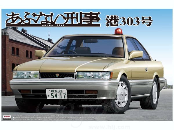 A reissue of Aoshima's standard curbside (no engine detail) kit of the Nissan Leopard. Body is molded in white, interior in tan, chassis in black. Matte chrome rims. Wheels turn and steer after assembly. Decals are included for markings. This version is from the "Abunai Deka" ("Dangerous Detectives") film series about Yokohama City cops. Call sign "Minato 303"!