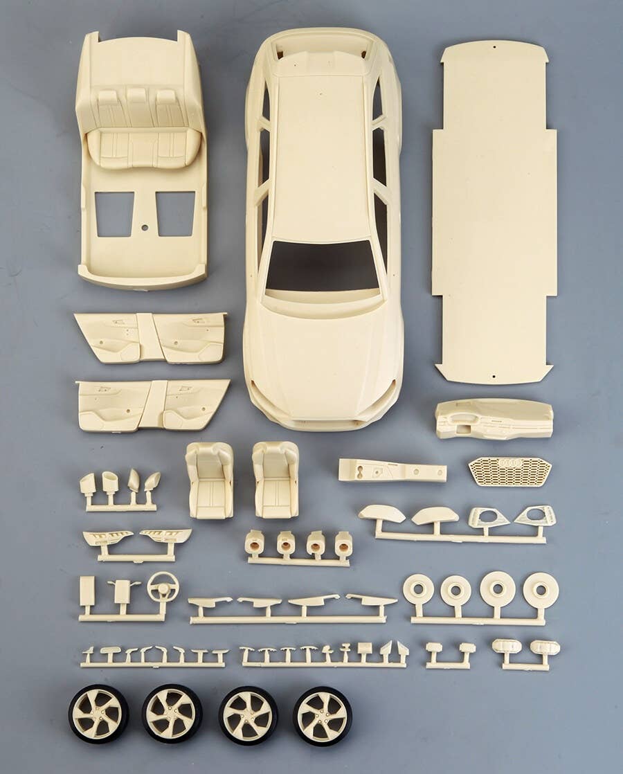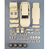 This is a car model kit assembled from parts made of resin, white metal, photo-etched metal and possibly other materials.