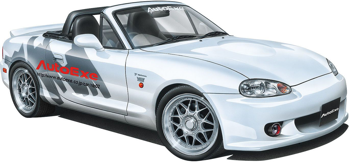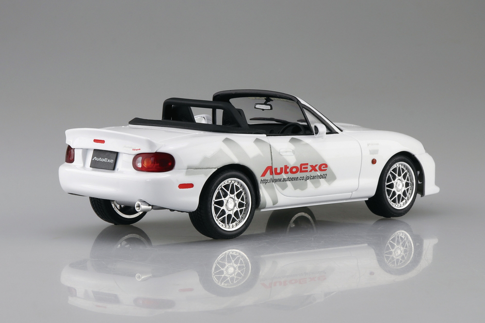 Aoshima's 1/24-scale model kit of the 1999 Mazda Auto Exe NB8C Roadster includes a front nose (NB-02), rear spoiler, style bar, muffler, aluminum foil, and window frame masking stickers. Place your order today!