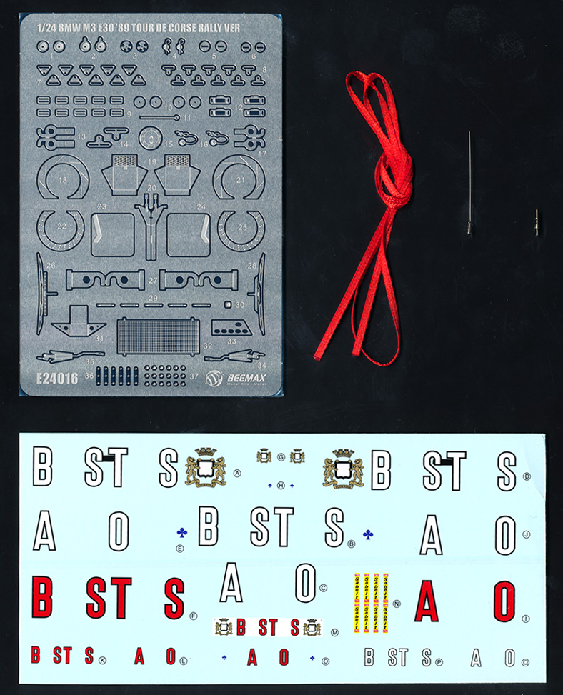 This set of detail parts for the Beemax No.18 BMW M3 E30 '89 Tour de Corse features photo-etched parts, fabric seat belts, and a metallic antenna, for an incredibly sharp finish!