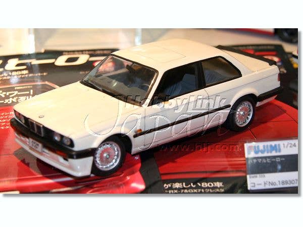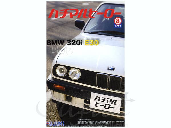Standard curbside (no engine detail) kit of the BMW 320i. Body is molded in white; interior is molded in white and suspension molded in black. Matt chrome rims. Decals are included for interior and exterior markings. Metal exhaust pipes and a choice of steering wheels is included. One of Fujimi's Hachimaru (80) Heroes, their line of famous cars of the 1980s.
