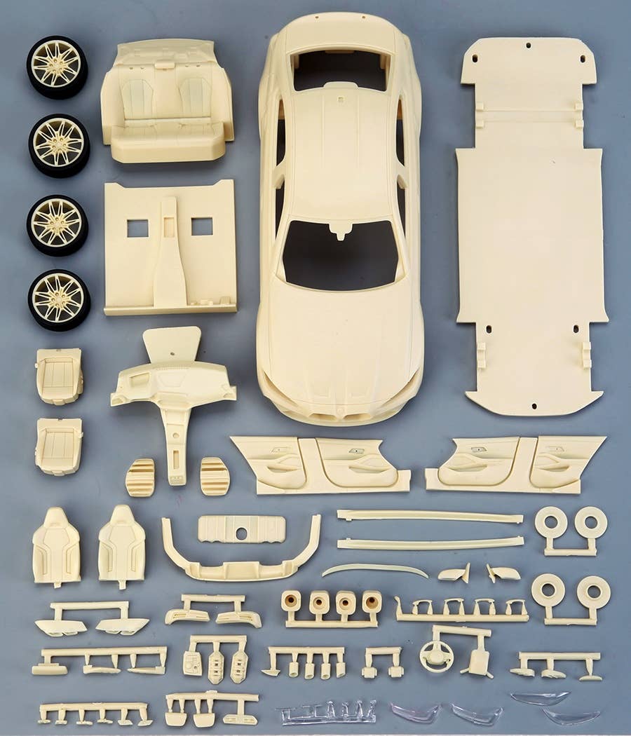 This is a car model kit assembled from parts made of resin, white metal, photo-etched metal and possibly other materials.