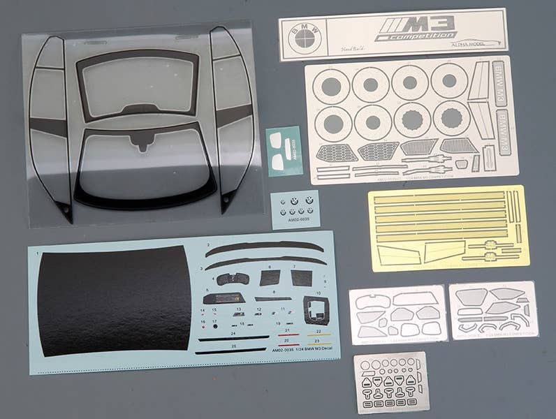 Alpha Model's multi-media model kit of the BMW M3 includes resin body parts, resin dashboard parts, photo-etched detail parts, waterslide decals, rubber tires, and clear parts for the windows and lights. The astonishing level of detail in this kit will result in an amazingly realistic replica for your collection shelf -- place your order today!