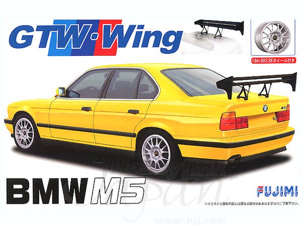 A beautiful curbside (no engine detail) kit of the BMW M5. Body and interior are molded in yellow and black. 18-inch BBS RE wheels are in a matte chrome finish. Includes cool high-flying GT wing for the rear deck. Wheels turn and steer after assembly.