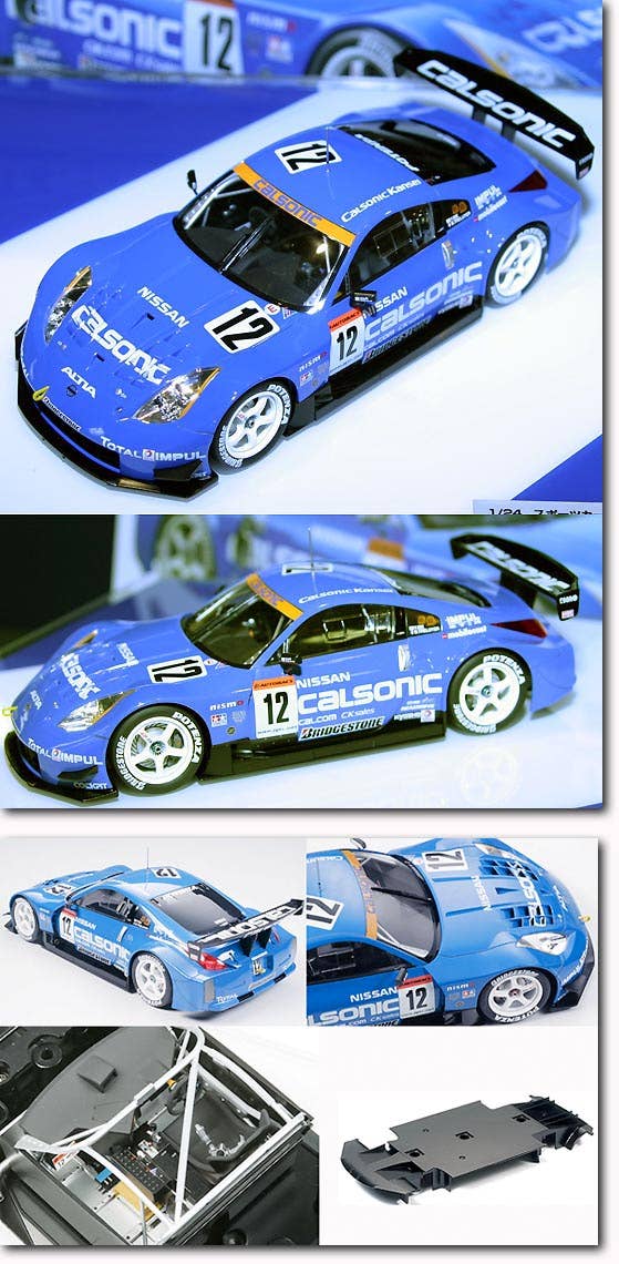 Beautifully-molded injection plastic kit of the Calsonic Impul Z features a prepainted die-cast metal underpanel, which gives the completed model a solid feel; the body screws on for a secure fit. Superbly-painted chrome-plated parts, clear red parts for the brake lamps, metal-transfer emblems and mirrors, and beautiful decals for number 12 will help you finish this gorgeous car to perfection!