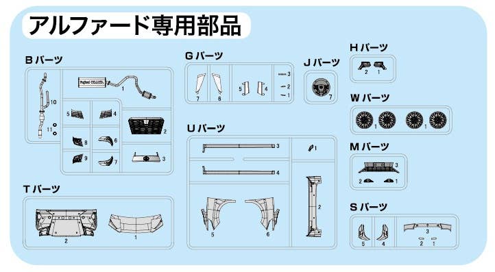The third-generation Toyota Alphard is represented in this model kit from Fujimi! This version reflects updates made to the Alphard in late 2017, including the large plating grill (made with resin plating, similar to the real thing!) and the rear reflector. This kit snaps together so glue is not needed, and it's molded in color so painting is also not necessary (although as with just about any model kit, it'll look even more amazing with some paint). Executive Lounge wheels are included too. Seals are included for the window frames, emblems, roof moldings, etc., and the black shadow part of the window glass is equipped with a window film that can be used as window masking.