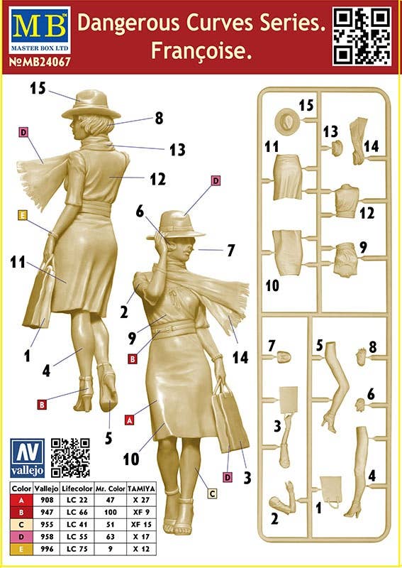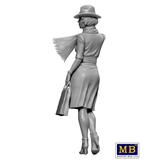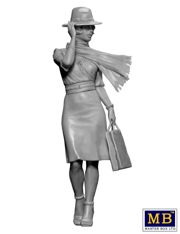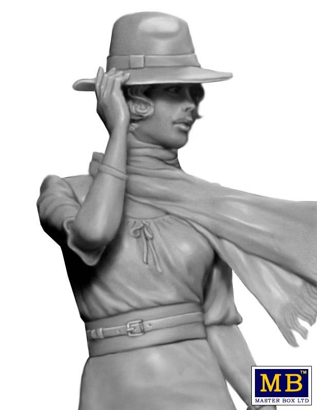 This figure kit from Master Box builds a single 1/24 scale figure of Francoise from the Dangerous Curves Series! Her simple dress and handbag are accessorised with a scarf and a men's style hat, and she's heading into the night, who knows where or why.