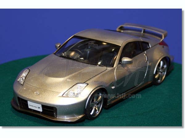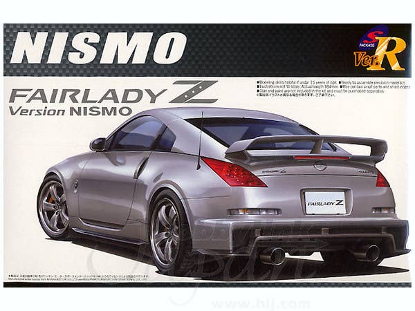 Check out Aoshima's beautiful curbside kit (no engine detail) of the 2007 Nissan Fairlady 350Z! This is the Nismo (Nissan Motorsports) version, featuring special front and rear bumper treatments, side aero parts, fender lacing braids, rear spoiler, exclusive Nismo wheels finished in matte chrome, and large-diameter sports mufflers. Right-handed steering interior. Body is molded in silver, with interior, chassis, and suspension molded in black. Sharp!