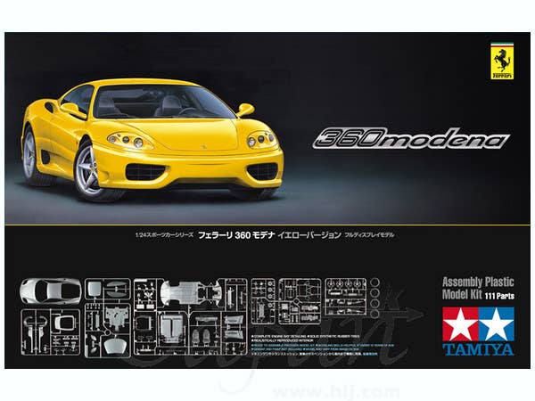 Tamiya's engineers have yet again produced an amazing reproduction of an amazing vehicle, the Ferrari 360 Modena. From the accurately reproduced chassis and suspension to the precisely reproduced 3.6L V8 engine, the attention to detail shows. The interior is perfectly reproduced, right down to the 360 Modena logo on the dashboard. To complete the kit, tiny metal transfers of the Ferrari logo are included for the hood, interior, air chambers, and rims. Even the disc brake calipers have markings!