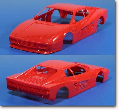 Standard curb-side kit of the Ferrari 512TR America. Body molded in red. Interior and chassis molded in black. Matte chrome rims. Wheels turn and steer after assembly.