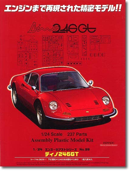Gorgeous full-detail kit of the Ferrari Dino 246GT is entirely molded in ABS plastic, but includes some screws for secure assembly, and of course rubber tires. Beautiful decals for the interior and exterior include European-style and Japanese-style licence plates. Beautifully-chromed parts add superb detail to the finished model.