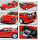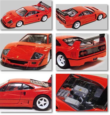 Nice curbside kit (limited engine detail) of the Ferrari F40 Le Mans. Body molded in red. Interior and chassis molded in grey. Matte chrome rims. Wheels turn and steer after assembly.