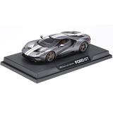 This is a factory finished model depicting the sumptuous Ford GT in detailed 1/24 scale. The refined, racy lines of the car are depicted in style, including the distinctive buttresses, door-side air tunnels and underside design. A luxurious bright gun metal painted finish is accented with twin white stripes down the car center, while the interior is finished in a black theme with white seat and dashboard sections. Matte plated rims and titanium silver color brake calipers will draw your eyes to the wheels, and the rear is adorned with a metal exhaust tip for super realism. The model comes on a stand with nameplate and clear case.