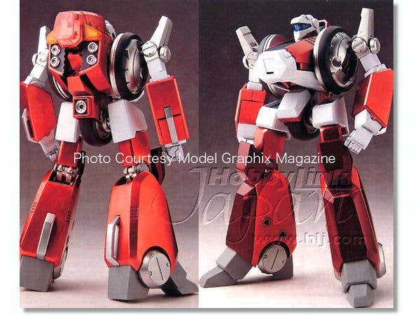 Sharply molded in color, this nicely detailed kit of Shogo's Garland from the "Megazone 23" OVA series will be fully transformable from Maneuver-Craft mode to Maneuver-Slave mode upon completion. Two in-scale, unassembled figures of Shogo Yahagi (one riding and one standing; both are molded in yellow) are included. Although a sheet of decals is provided for detail, the kit and the two Shogo figures in particular will require painting for a more accurate appearance. The photos shown below are of a completed and painted prototype.