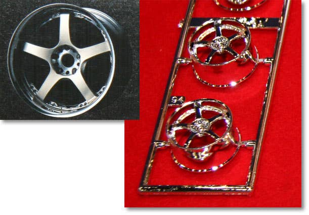 This is a set of plastic or metal wheels and rubber-like tires for detailing car models.