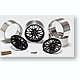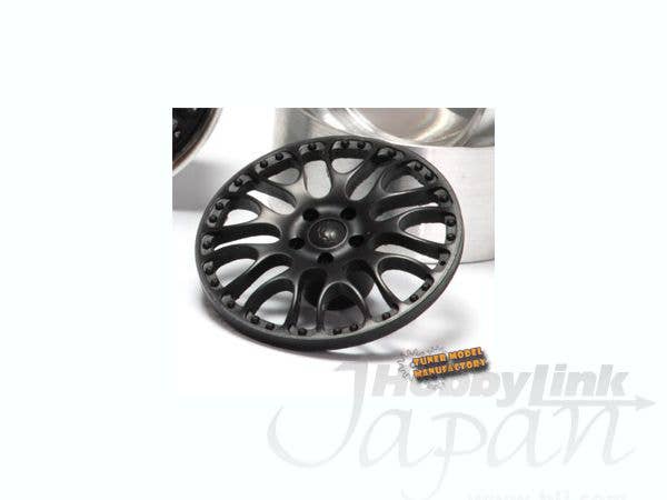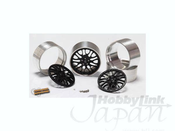 A set of four highly-detailed wheels, with 4 turned aluminum rims, 4 black resin spokes, 20 metal allen lug nuts, and 4 metal hex valve stems.