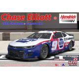 This model kit from Salvino JR Models accurately reproduces all aspects of the 2022 Camaro in patriotic markings fielded by Hendrick Motorsports and driven by Chase Elliott, including the engine, suspension, and interior features such as the roll bar and net. Large-size decals by Power Slide are included, as are soft resin tires. Order yours today!