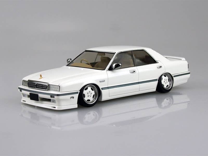 Here's a detailed curbside kit of the IMPUL Y31 Cima Early Type Kiwami Touji Version from Aoshima. Body and interior are molded in white with the underside molded in black plastic. Features chrome wheels and black rubber tires, plus decals for the exterior and interior.