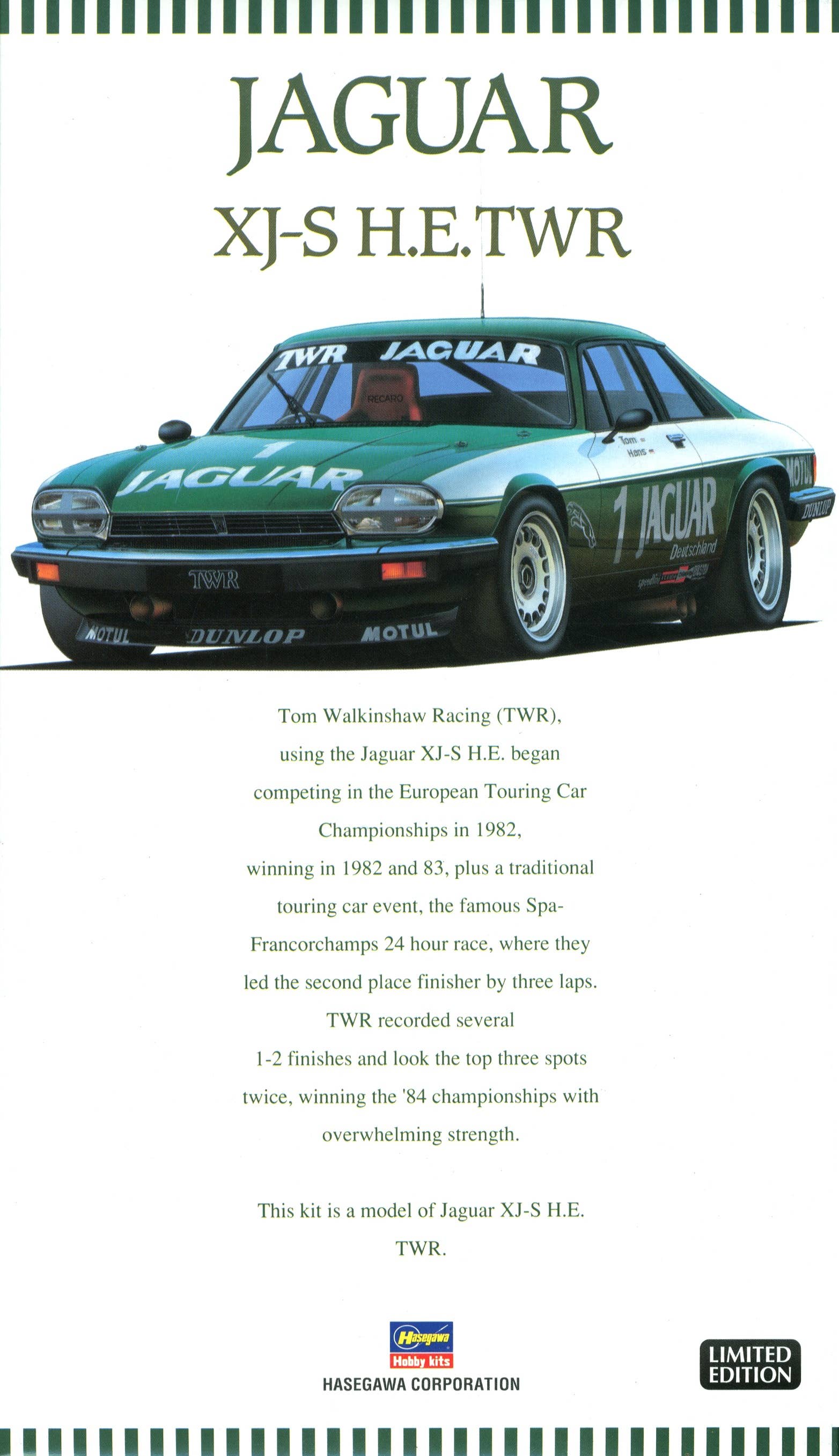 Long, low, and powerful, the Jaguar XJS was a beauty of a car. The "High Efficiency" H.E. version took the concept and drove it just a little further. With a new engine, the car was not only more efficient, but also higher powered. One might reasonably ask why a V12 could ever possibly need to be more powerful, but the answer would always be 'why not'. Tom Walkinshaw and his racing team put the type through its paces and won the 1984 European Touring Car Championship. This limited edition kit features decals for the 1984 European Touring Car Championship Car No. 1.