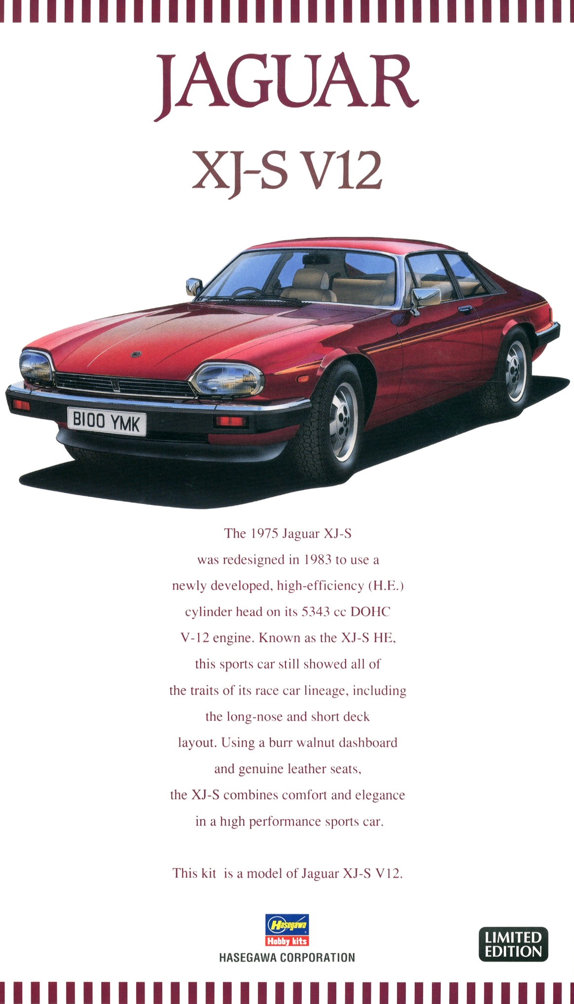 Jaguar is synonymous with performance and performance. That is nowhere more apparent than in the V12 powered XJ-S. This exceptionally long-nosed vehicle had an engine which turned the comparatively small car into nothing less than a rocket on wheels. Plus, in the stylistically starved seventies, it was one of the more exceptionally well modeled cars. A thoroughbred amongst plow horses. This limited edition kit features highly detailed parts and full decals.