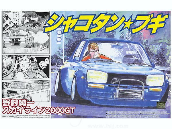 From the popular manga "Shakotan Boogie" ("shakotan" means "low ride height" in Japanese) comes a faithful rendition of Junichi Nomura's Nissan Skyline 2000GT. A curbside kit with no engine detail, the body is molded in blue, with the interior and chassis molded in black. Aero "tuner" parts are included, with deep chrome rims and super-fat, super-low-profile tires. Decals are included for the interior and exterior. Figure is not included.