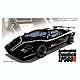 Standard curbside (no engine detail) kit of the Lamborghini Countach LP500R. Body molded in black; interior molded in gray. Matte chrome rims. Wheels turn and steer after assembly.
