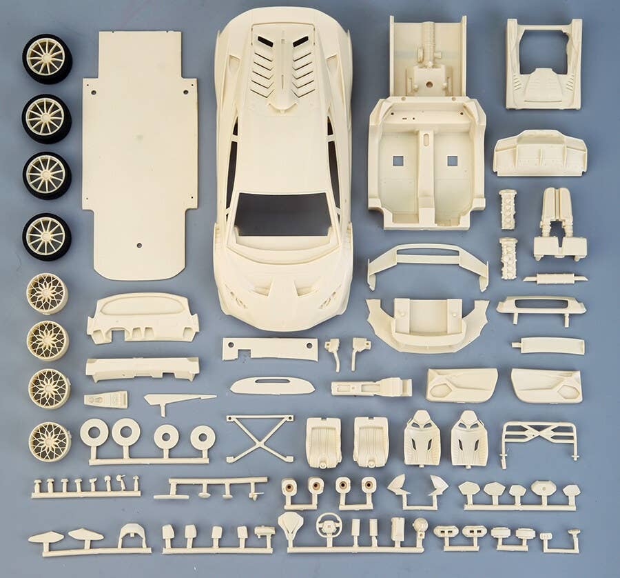 This is a car model kit assembled from parts made of resin, white metal, photo-etched metal and possibly other materials.