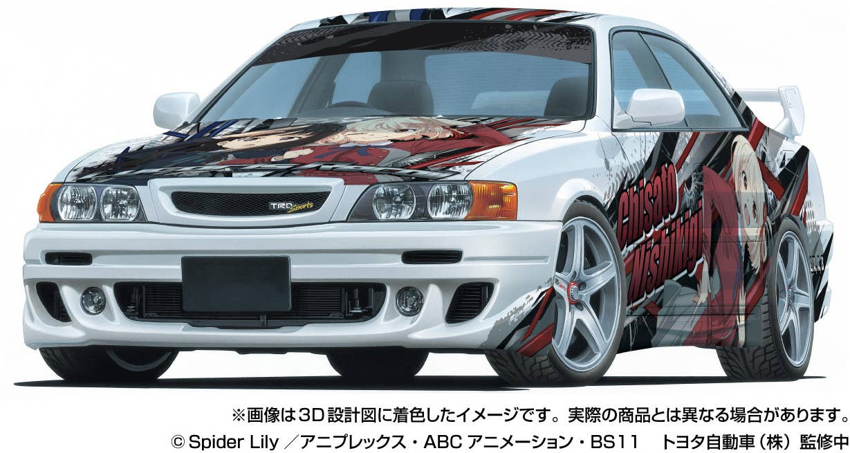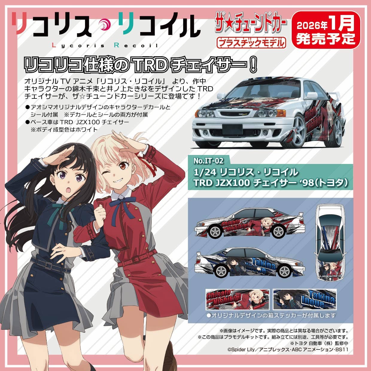 Aoshima brings us a 1/24-scale model kit of the 1998 Toyota TRD JZS100 Chaser with markings based on the TV anime "Lycoris Recoil"! Chisato Nishikigi and Takina Inoue make this car extra eye-catching with the Aoshima original decals and stickers; bonus original box stickers are included too. Order it for your own collection today!